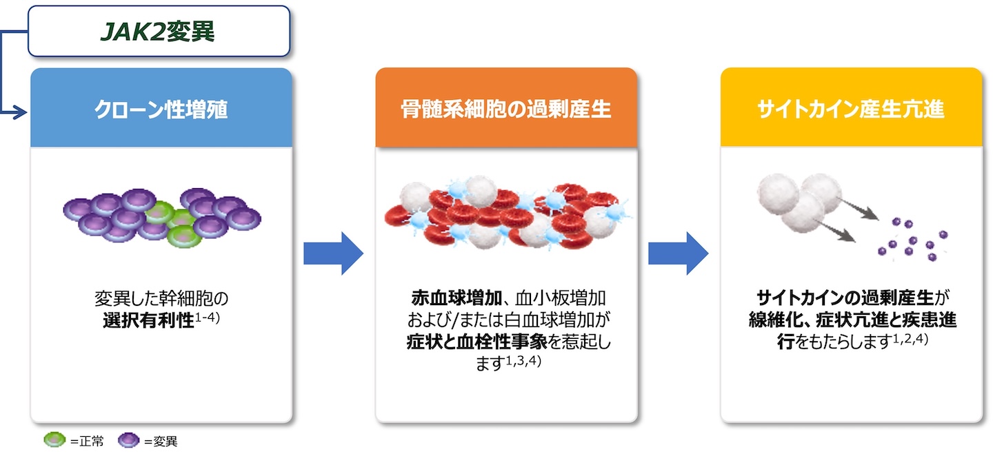 JAK2変異は骨髄系細胞の過剰産生、サイトカイン産生亢進などのプロセスにより、PVの疾患進行に関連することが示されています。