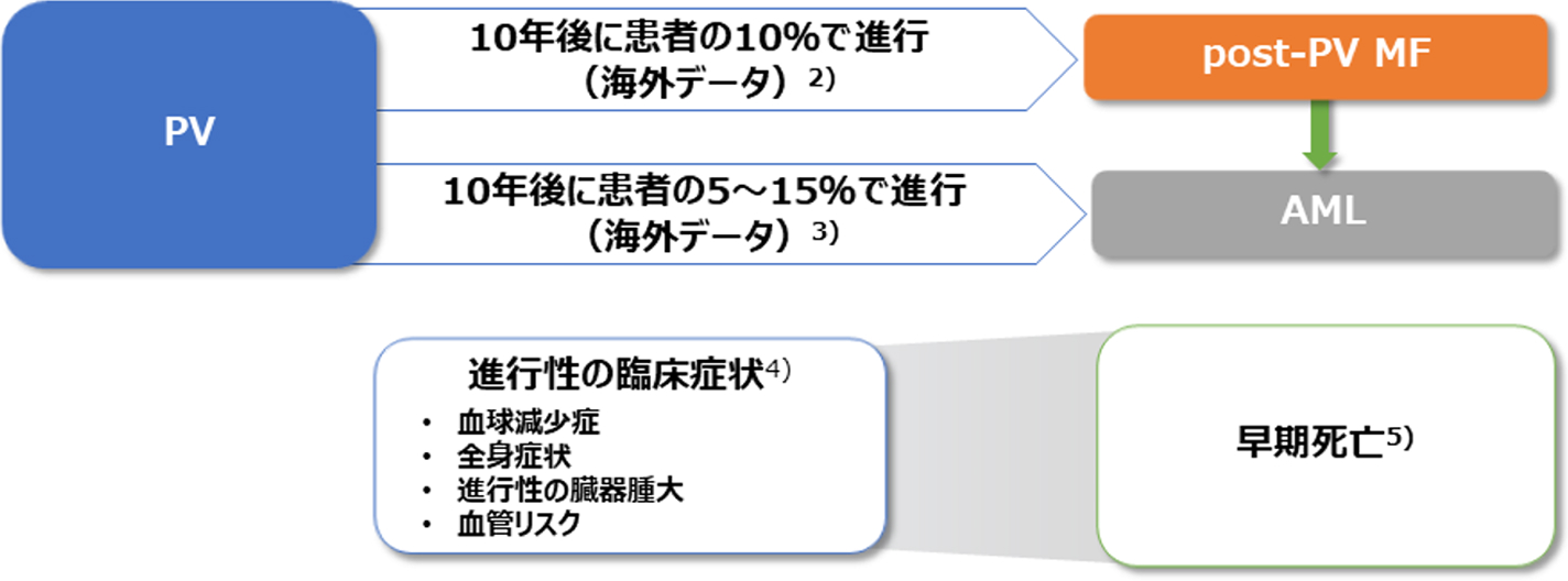 PVは骨髄線維症(MF)や急性骨髄性白血病(AML)に移行する可能性があります。